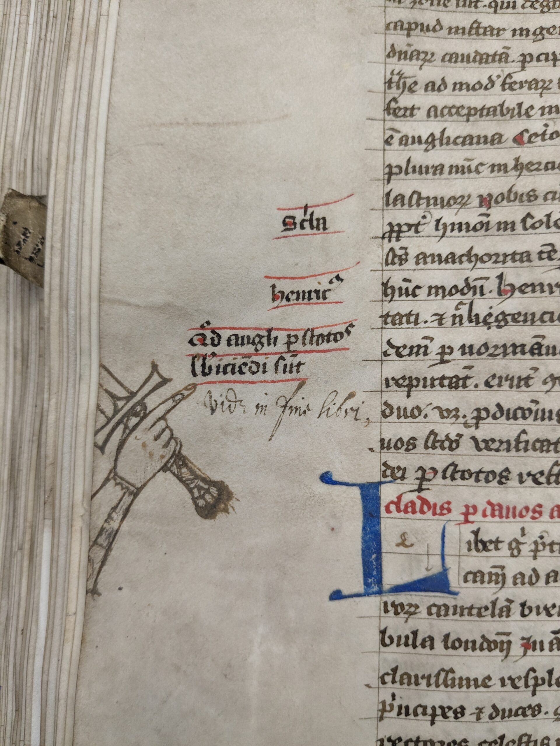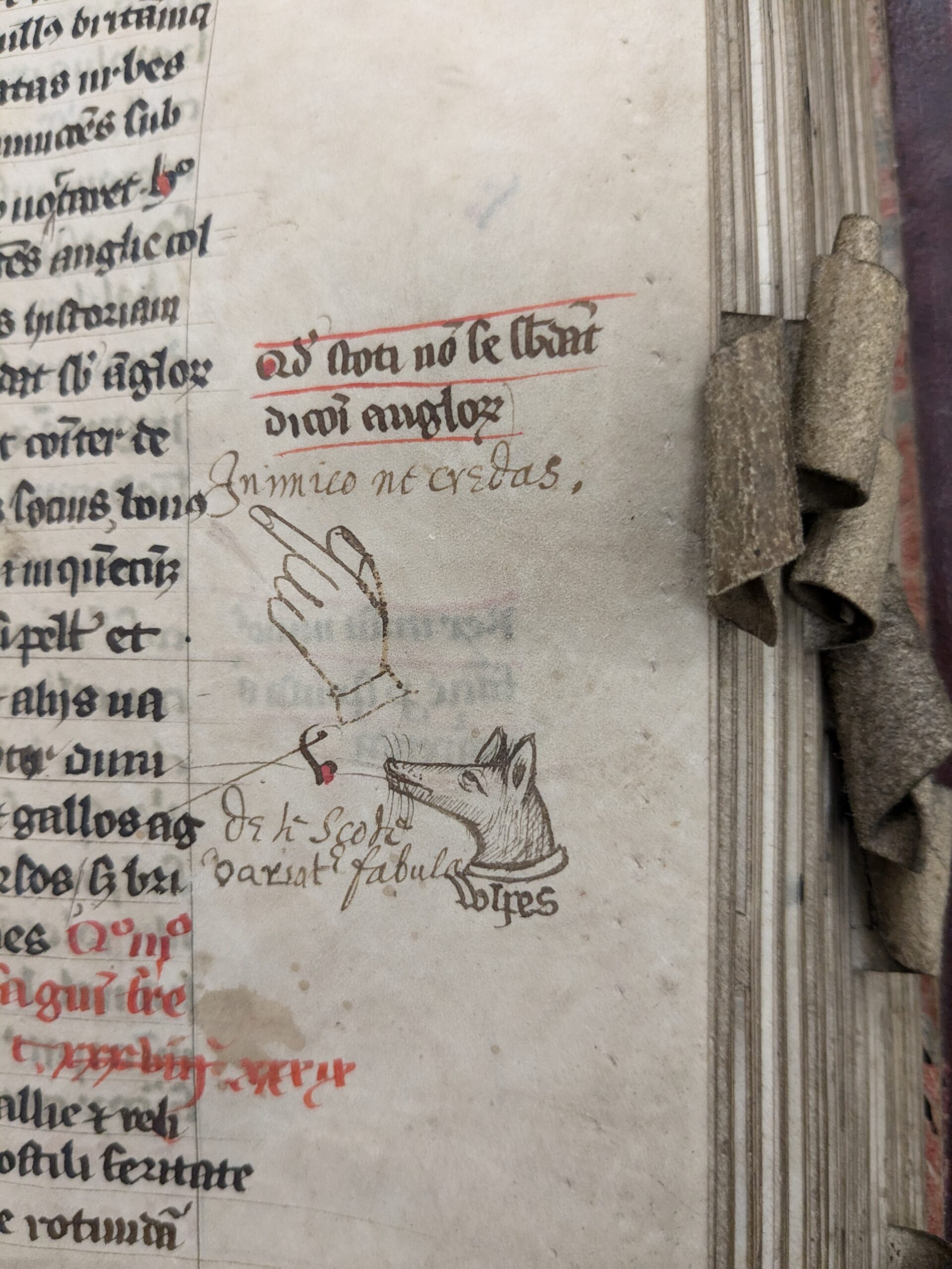 In each instance, the images have been added by the same later reader to highlight a particularly vehement piece of anti-English rhetoric. The raised hand grasping the ornate hilt of a sword has been added to visually emphasise a key point. The hand has evidently been added over a pre-existing manicule and you can see a longer fingertip protruding from underneath this newer addition. The sword is brandished over a section of text dealing with a holy anchorite in Ethelred’s time who prophesised English downfall at the hands of the Danes, Normans, and Scots. ‘Because the English are given over to treachery and drunkenness and disregard for the house of God, they will have to be crushed first by the Danes, then by the Normans and thirdly by the Scots, whom they regard as worthless.’ Later in the manuscript the same reader draws an arresting image of a small alert fox labelled ‘vulpes’. A fine line connects the drawing to the text of the following verse: